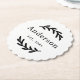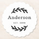 Elegant rustic wedding coasters featuring a scalloped edge design with delicate laurel branch accents on a clean white background. The family surname and established date in refined black typography form a classic monogram keepsake. A lovely reception table accent or personalised wedding favour. Personalise with your last name and year.