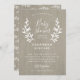 A rustic baby shower or couples shower invitation featuring the hand drawn white laurel branches on a white oak wood background. On the reverse side of the invitation is a coordinating laurel branch pattern.