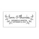 Rustic Laurels Wedding Favour Rubber Stamp featuring hand drawn rustic laurels with word "love & thanks" in modern calligraphy font style and details in modern sans serif font style.