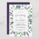 This rustic lavender and eucalyptus graduation party invitation is perfect for a simple and elegant outdoor grad party. The floral design features watercolor eucalyptus leaves and greenery with sprigs of purple wildflowers.