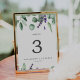 This rustic lavender and eucalyptus table number is perfect for a simple and elegant outdoor wedding. The floral design features watercolor eucalyptus leaves and greenery with sprigs of purple wildflowers. The card prints on the front and back (double-sided). Add each table number that you need to your cart individually.