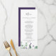 This rustic lavender and eucalyptus wedding dinner menu card is perfect for a simple and elegant outdoor wedding. The floral design features watercolor eucalyptus leaves and greenery with sprigs of purple wildflowers. This menu can be used for a wedding reception, rehearsal dinner, or any event.