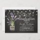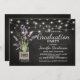 Country chic graduation party invitations ffeaturing a rustic black chalkboard background, string lights, a mason jar with purple lavender flowers, wrapped in burlap with the class year and a modern celebration template wording.