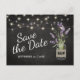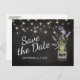 Country chic save the date postcard template featuring a rustic black chalkboard background, string lights, a mason jar with purple lavender flowers, wrapped in burlap with the couples initials and a save our date template that is easy to personalise.