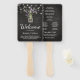 Country chic wedding program fans featuring a rustic black chalkboard background, string lights, a mason jar with purple lavender flowers, wrapped in burlap with the couples initials and a wedding order of service template that is easy to personalise.