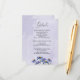 Theme Parties' pretty wedding details enclosure card design features pretty periwinkle / blue daisies bouquet set on a pastel lavender background with white watercolor swatches. Include your accommodations information, welcome reception details, and farewell event details here. #WeddingDetails #RusticWedding #PurpleDaisies