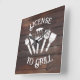 Featuring a distressed white graphic of grilling utensils on a wood-textured background, this clock is a perfect blend of style and wit.