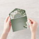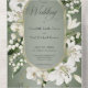 AVAILABLE WITH OR WITHOUT A QR CODE OR DINNER SELECTION OPTIONS. This wedding invitation features a visually captivating design, starting with a dark sage green background that sets an elegant and sophisticated tone. Overlaid on this background is a subtle white blur, adding a touch of softness and depth to the overall appearance. Encircling the invitation is a delicate gold oval frame composed of white lilies and lily of the valley flowers. These graceful blooms are intricately detailed, showcasing their natural beauty and representing purity and new beginnings. The lilies and lily of the valley flowers intertwine with lush greenery, creating an enchanting frame that exudes a sense of romance and charm.