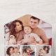Trendy and festive multi-photo design featuring three small and one large template, custom decorative white "Happy Holidays" calligraphy script and editable text field on warm rustic linen texture background. Panels feature complementary script, linen background, photo templates, additional text fields and unique tear-away keepsake photo.