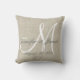 Personalised wedding gift for newlyweds.Rustic printed linen look and white monogram initial pillow with bride and groom names and wedding date in a script font overlay design on a PRINTED beige linen photo effect background. Elke Clarke© for MonogramGallery at Zazzle. Makes a great gift for newly weds. Great trendy, elegant accessory for your bedroom, favourite chair, as fun home decor in your bedroom, living room, family room or formal decorative addition to your living room. Customise with your names, monogram initial and wedding date.