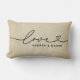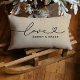 A rustic lumbar pillow featuring Love in flowing black heart script with customisable couple names on a textured beige linen background. The earthy, farmhouse-inspired design makes a charming wedding gift, anniversary keepsake, or cosy living room accent. All text is fully editable to personalise with any couple's names.
