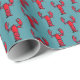Design features a watercolor and ink lobster. The lobster is painted in a rustic style, with rough lines and unevenly painted areas. Dark ink splotches provide texture and visual interest. This lobster is a red and black illustration with a deep teal background.