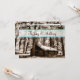 This rustic country photograph in sepia tone features an old hunter's log cabin in the woods sitting beneath tall pine trees. The photo has a sepia coloured effect giving it a rustic look. One side of the rustic country wedding invitation has the bride and groom names across a transparent stripe near the top that is accented with teal blue. The other side of the rustic wedding invitation has the same rustic log cabin scene among the pine trees with the wedding invitation details. These invitations are perfect for rustic weddings with teal and brown wedding colours.
