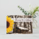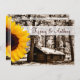 This rustic country photograph in sepia tone features an old hunter's log cabin in the woods sitting beneath tall pine trees. The photo has a sepia coloured effect giving it a rustic look. It has a bright yellow sunflower on the side of the design. One side of the rustic country wedding invitation has the bride and groom names across a transparent stripe near the top. The other side of the rustic wedding invitation has the same rustic log cabin scene among the pine trees and the sunflower with the wedding invitation details.