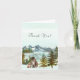 This is a forest, mountain theme design, with momma and baby lynx. "Let the Adventure Begin!" is the inspiration. This design has rustic, watercolor mountains with reflecting lake in front, and pine trees surrounding the lake. Adult lynx with her cub in front with "Thank You!" text. On back is a watercolor mountain and pine tree scenery with floral, oval wreath.