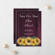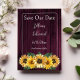 Personalise a unique wedding announcement with a Rustic Magenta Sunflower Save the Date. Announcement design features a rustic wooden background with an elegant bouquet of sunflowers. Additional save the date announcement available for this design in a variety of colours.