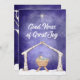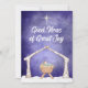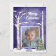 All of the text on this cute card can be edited. The front has a cute manger scene and a simple greeting. "Good News of Great Joy" but you can change the text if you want. The back has space for your own photo, framed by birch trees, a small Christmas tree, and a string of Christmas lights.