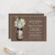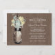 Perfect for a country style Bridal Shower or maybe you just love Mason Jars for any event! Mason Jar hanging on a hook filled with country wildflowers. A Rustic Brown background with a hanging Mason Jar and wildflowers in colours of mauve, soft romantic yellows and muted greens. If you have any questions on this design or want a colour change please email me paula@labellarue.com Also check for the Wedding Suite, INVITATION, RSVP, RECEPTION and GUEST SEATING Cards to match!
