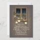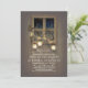 Rustic country engagement party invitations with tree branches, mason jars, string lights, and old barn window.
