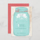 This rustic wedding invitation suite features a hand-drawn minty blue mason jar on a tree bark background. Hand-lettered type, the gingham pattern at the back and a tag attached with red & white bakers twine makes this a perfect choice for country theme weddings. Colours can be customised to suit your wedding's motif, just shoot me a message.