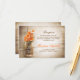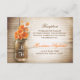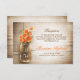 Rustic wooden wedding reception with mason jar and orange flowers.