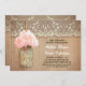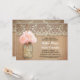 Cute rustic rehearsal diner invitation featuring mason jar with pink hydrangea blossom. Perfect invite for country rehearsal dinner with vintage lace and distressed wood accents.