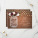 This wedding save the date card features a rustic wood background, with a mason jar topped with burgundy and blush watercolor florals, and string lights at the top.
