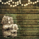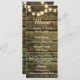 Rustic wood wedding dinner menu and string of lights. The menu is part of a wedding invitation set