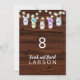 A rustic wood textured wedding table numbers with floral hydrangea mason jars and string of lights. The wedding table numbers are part of a wedding invitation set.