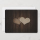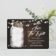 Rustic wedding save the date card featuring a mason jar and burlap hearts against a barn wood background adorned with string lights. Easily personalise this romantic rustic wedding save the date online. Matching items available to complement this rustic country wedding save the date.