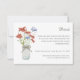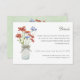 Rustic details card featuring watercolor meadow wildflowers in a white ball jar. On the other side a wildflower wreath on green watercolor wash background, flowers such as poppies, cornflowers and grass.