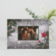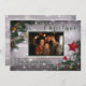 Rustic Merry Christmas Family Photo Card. Celebrate the holidays with this rustic country style Merry Christmas photo card. The white barn yard background is beautifully adorned with delicate snowflakes and pine branches, snowflakes, stars and holiday bulbs, evoking the magic of winter. The front features a customisable family photo with a red photo frame and green script calligraphy at the top of the card, while the back includes a heartfelt holiday message with your family members' first names. Type is in green. Make this card uniquely yours by personalising the photo and text to end warm holiday wishes to your loved ones.