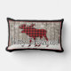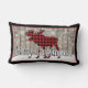 This modern and trendy rustic lumbar pillow will add some festive flair to your Christmas holiday home decor. The pillow features a large red and black Buffalo plaid checked pattern moose silhouette on a barnwood look background with snow hills and falling white snowflakes on it with the play on words of Merry Christmas being changed to say, "Merry Christmoose!" instead.There is a black border trimmed in red that surrounds the outer edges of the pillow.