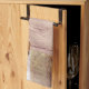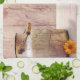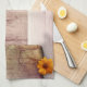 A kitchen towel with a rustic country design. An old rusting milk can with a pretty orange gerbera flower by its side. Wheat and faded red poppies in the background set against a faint wood panel. Wood is just an image, not real.