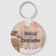 Commemorative wedding keychain with a rustic country theme. An old rusting milk can with wheat and faded red poppies in the background set against a faint wood panel. Personalise with the wedding couple's names and wedding date.