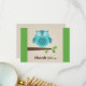 Blue owl on tree branch "Thank You" note cards. Write your personal thank you note on the back of the card. Colours include turquoise blue, green, chocolate brown, taupe and powder blue.