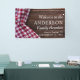Celebrate your family reunion with this perfect picnic or barbecue banner - red and white chequerboard plaid table cloth covering a dark wood texture design with modern typography showcasing your family name and celebration venue and date in an easily customisable way. Great as a welcome sign for any family gathering!