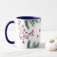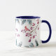 Modern rustic style seasonal winter holiday coffee mug featuring trendy navy teal and hunter green watercolor pine boughs, holly berries, and two red cardinal birds together with "Happy Holidays" editable dark pink typography script. Easy to personalise with your text +++++++++++ A nice Christmas holiday gift for family or business corporate partners.