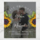 Rustic country traditional wedding save the date personalised wine label featuring beautiful sunflower bouquets on a dark transparent overlay photo background. ++++++++ Ideal for your summer or autumn fall elegant outdoor garden, farmhouse barn, or backyard themed weddings. Personalise it with the bride's and groom's photo, names, wedding date, and place!
