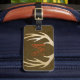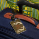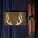 This design features a weathered background with deer antlers and a grunge monogram on one side and name and address on the other side.