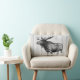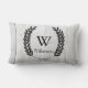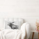 Detailed moose sketch on a white washed wood planks print on the front side of the pillow. The backside of the pillow features a black laurels wreath frame containing your choice of personalised monogram letter and family name in black text.