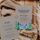 This rustic mountain bachelorette weekend with details invitation is perfect for an outdoor event. The design features a blue and green painted wilderness landscape with watercolor pine trees, birds and mountains on a faux light kraft paper background.
