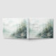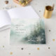 The front and back covers present a soft watercolor pine forest reflected in tranquil waters beneath a misty mountain backdrop. A text template on the front cover includes the bride and groom's names and wedding date. The spine text may be edited to your desired wording, or keep as shown. Colours include soft aqua, teal, green, blue and grey in various shades and watercolor washes. Make every guest feel welcomed into your unforgettable day surrounded by the peaceful beauty of nature.