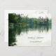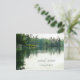 Rustic mountain lake save the date postcard with abstract image of a calm body of water with slight surface ripples on a day with overcast skies; reflection of distant trees, evergreens and rock structures can be seen on the water's surface | created from my own personal photograph and digitally enhanced with a subtle watercolor effect | part of the Mountain Lake Rustic Wedding Collection by katz_d_zynes >> https://www.zazzle.com/collections/119499271518309609