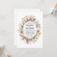 The flowers and foliage on this wedding invitation are arranged organically around and partly behind a central oval containing the text of the invitation. The hand painted florals, branches and greenery appear crowded and haphazard to produce a natural feel of a wild meadow in the mountains. The stunning variety of elements and colours produces a cheerful and chic look for this wedding invitation.