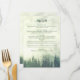 This rustic wedding menu features a lacy script calligraphy title and a wilderness mountain scene of green pine trees shrouded in mist or fog. The back has space for the names of the couple and wedding date. Perfect for an outdoor reception.