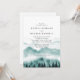 Elegant and rustic wedding invitation features watercolor mountain with trees and brides and grooms initials in the back with wedding details.