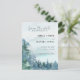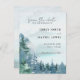Theme Parties' dark dusty blue budget-friendly save the date card (4.25 in. x 5.6 in.) design features watercolor trees and mountains set on a dark blue watercolor background. The typography pairs traditional lettering with modern hand-lettered text. #SaveTheDate #DustyBlueWedding #BudgetWedding