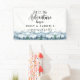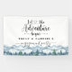 Elegant rustic watercolor mountains and forest scene wedding invitation, featuring lush blue and green trees and mountains with a script text: let the adventure begin. For those who love a romantic dreamy woodland vibe for their ceremony and celebration.