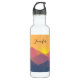 A personalised water bottle with a graphic illustration featuring many mountain tops with bright yellow sunlight setting behind the mountains. Made with geometric polygonal shapes.Simple minimalist design. Colours range from dark blue to desert red.